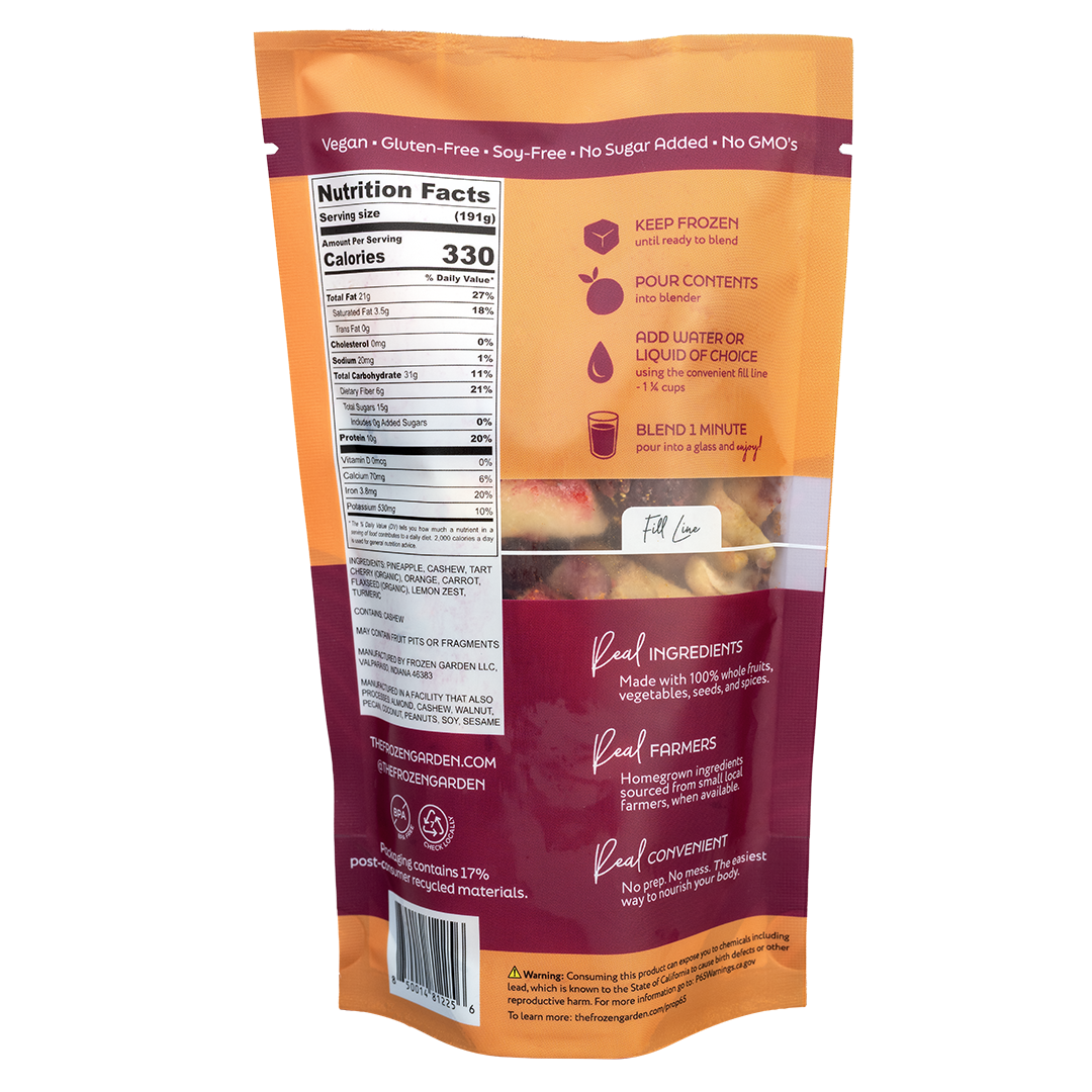 Pineapple, cherry, and citrus bring the brightness. Cashew, flax, turmeric, and sweet carrot add the substance. It’s like sunshine and self-care teamed up to kickstart your day, but with plant protein, no powders, and zero added sugar.